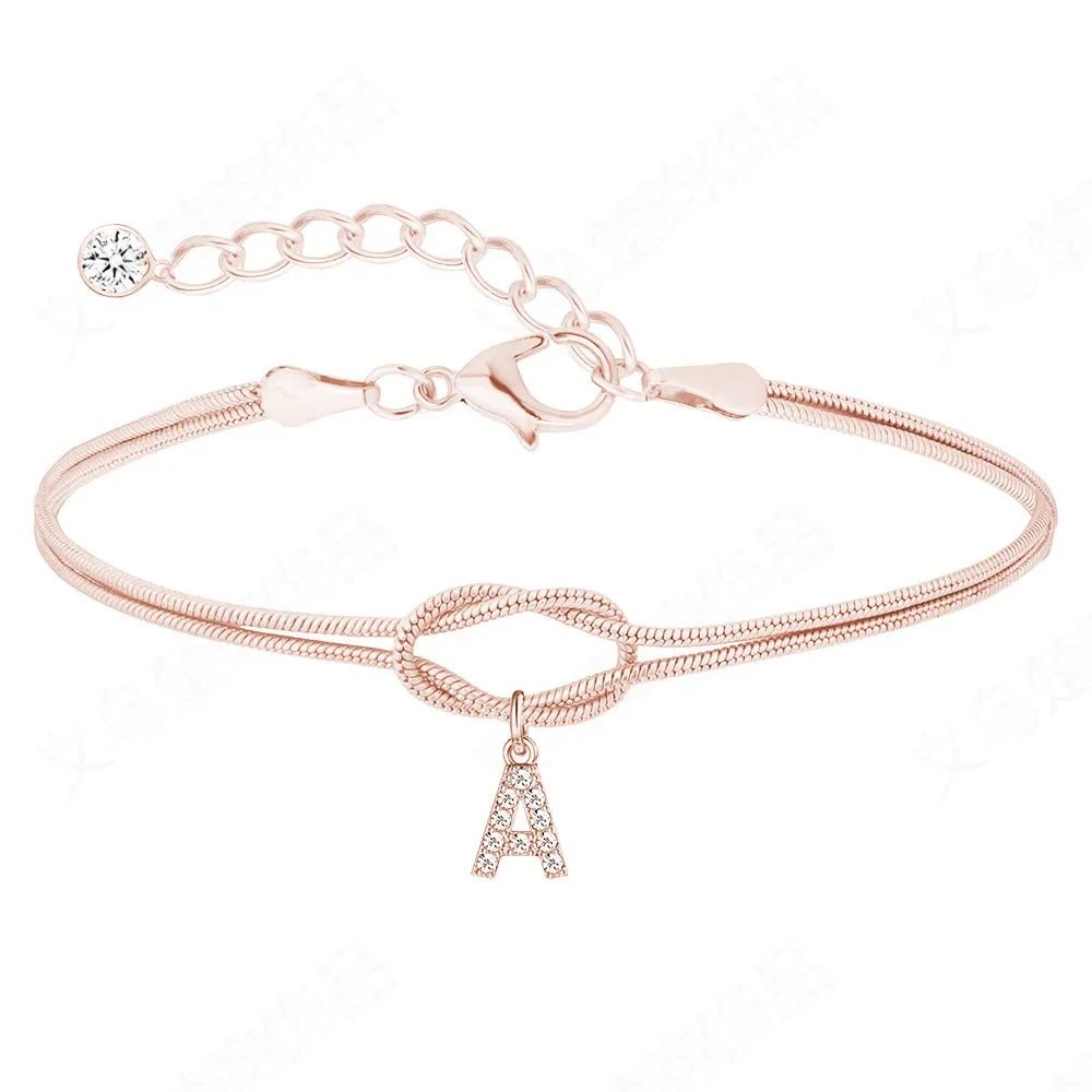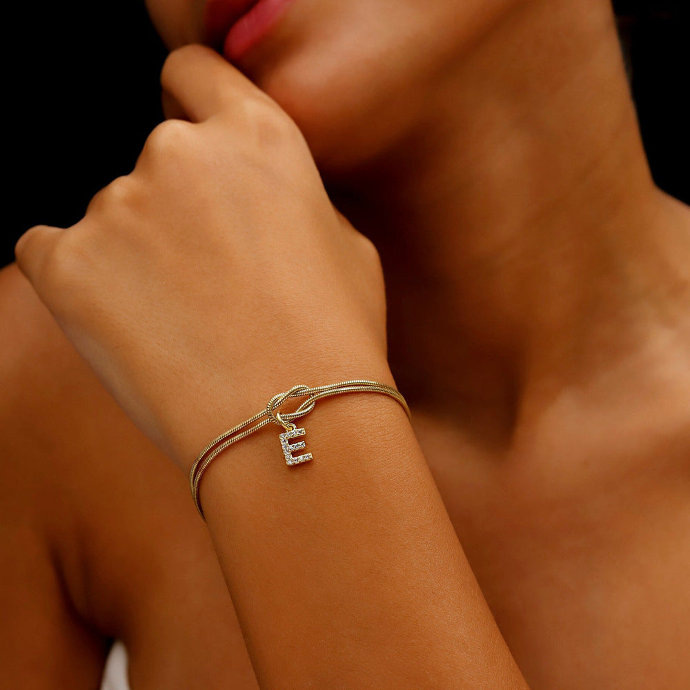 Il suo design minimale e sofisticato unisce una doppia catena con nodo centrale a un delicato ciondolo a forma di lettera , impreziosito da luminosi cristalli che riflettono la luce con ogni movimento.