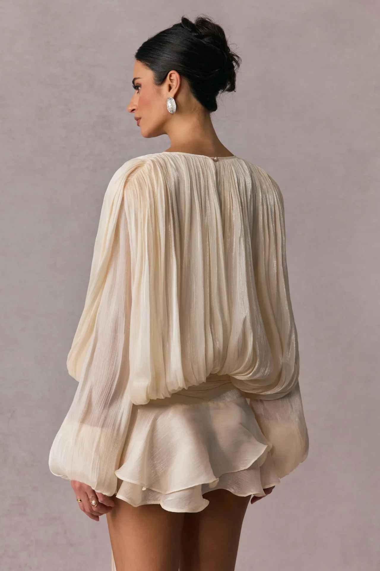La blusa con maniche lunghe e vaporose è accompagnata da un colletto da annodare, firma di una femminilità elegante e decisa. La vita è segnata da un drappeggio morbido che avvolge le forme con grazia, prima di lasciare spazio a una gonna corta con volant sovrapposti, leggera e piena di movimento.
