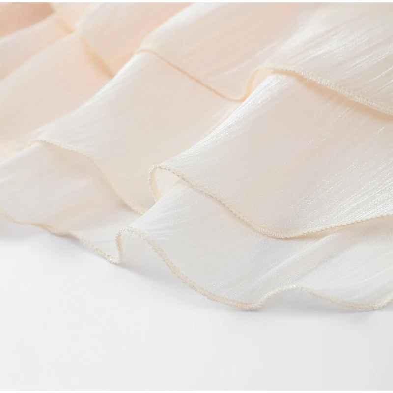 Il tessuto, composto da poliestere, viscosa e spandex, è leggermente elasticizzato, garantendo una vestibilità lusinghiera e comoda. La finitura completamente plissettata e l’orlo arricciato aggiungono un tocco di movimento e raffinatezza, perfetti per un look che cattura l’attenzione.